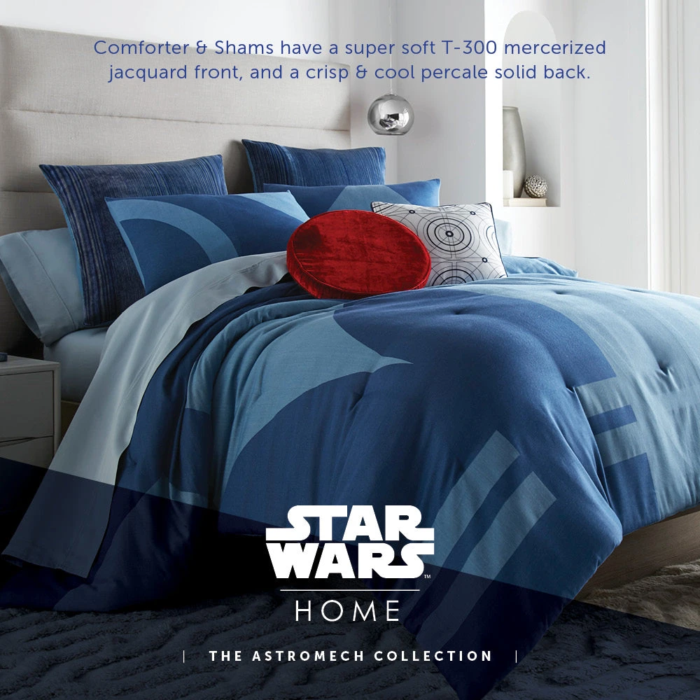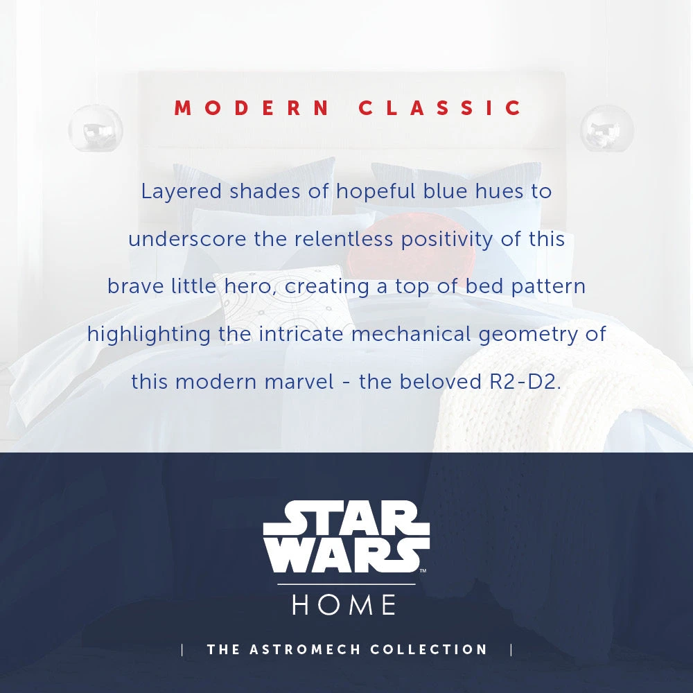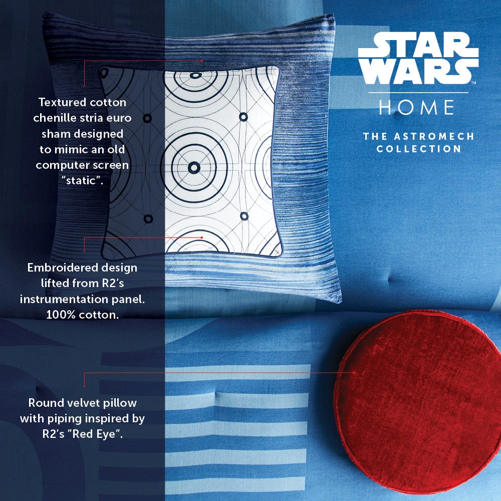 Bring the iconic R2-D2™ into your bedroom with our exquisite Star Wars bedding set. Inspired by the ever-faithful Astromech droid, this bed set is designed to capture the spirit of R2-D2™ with dynamic geometric patterns in various shades of blue. The textured ‘static’ look of our striped euro shams adds depth, and the set is crowned by the iconic round ‘Red Eye’ toss pillow, bringing the beloved feisty droid to life.