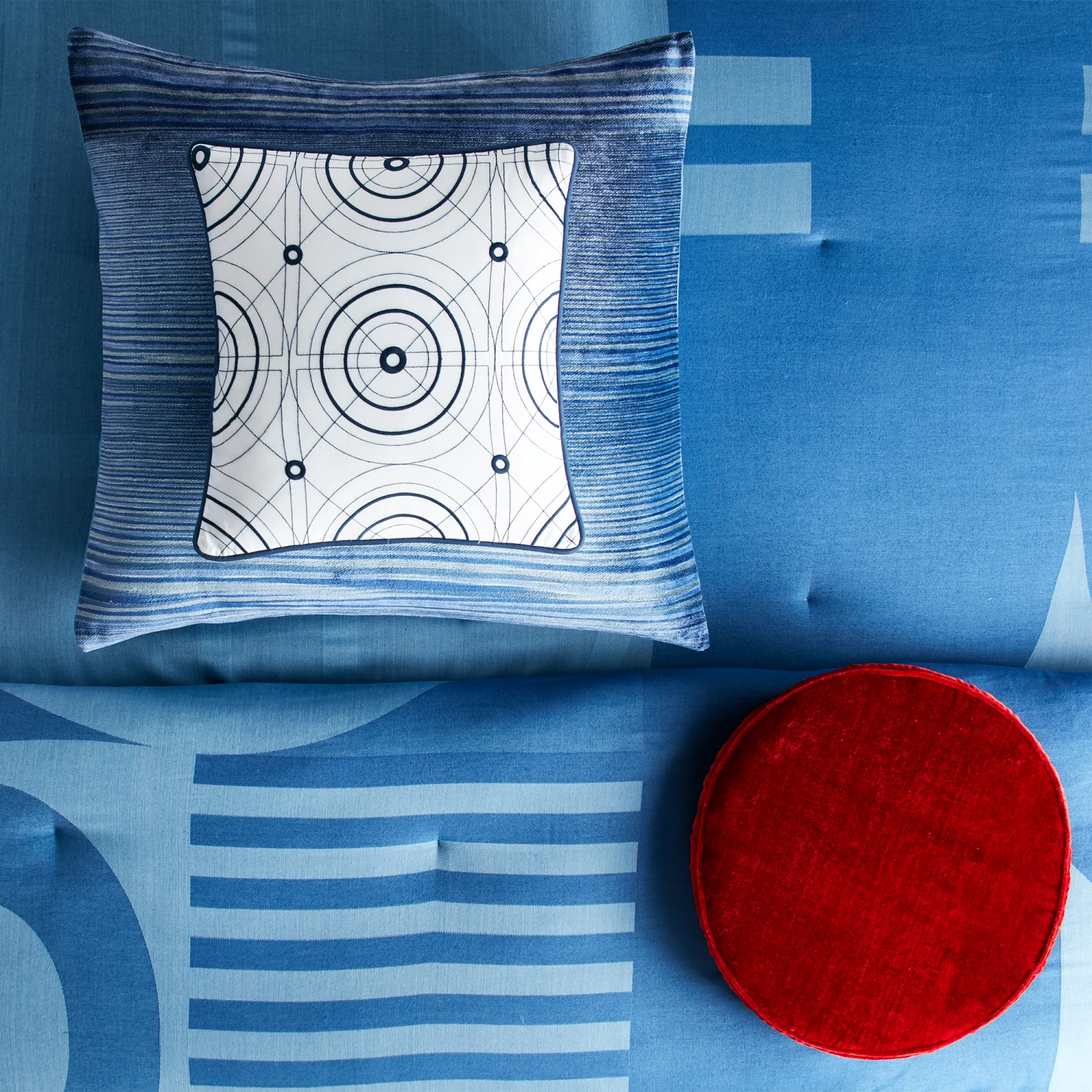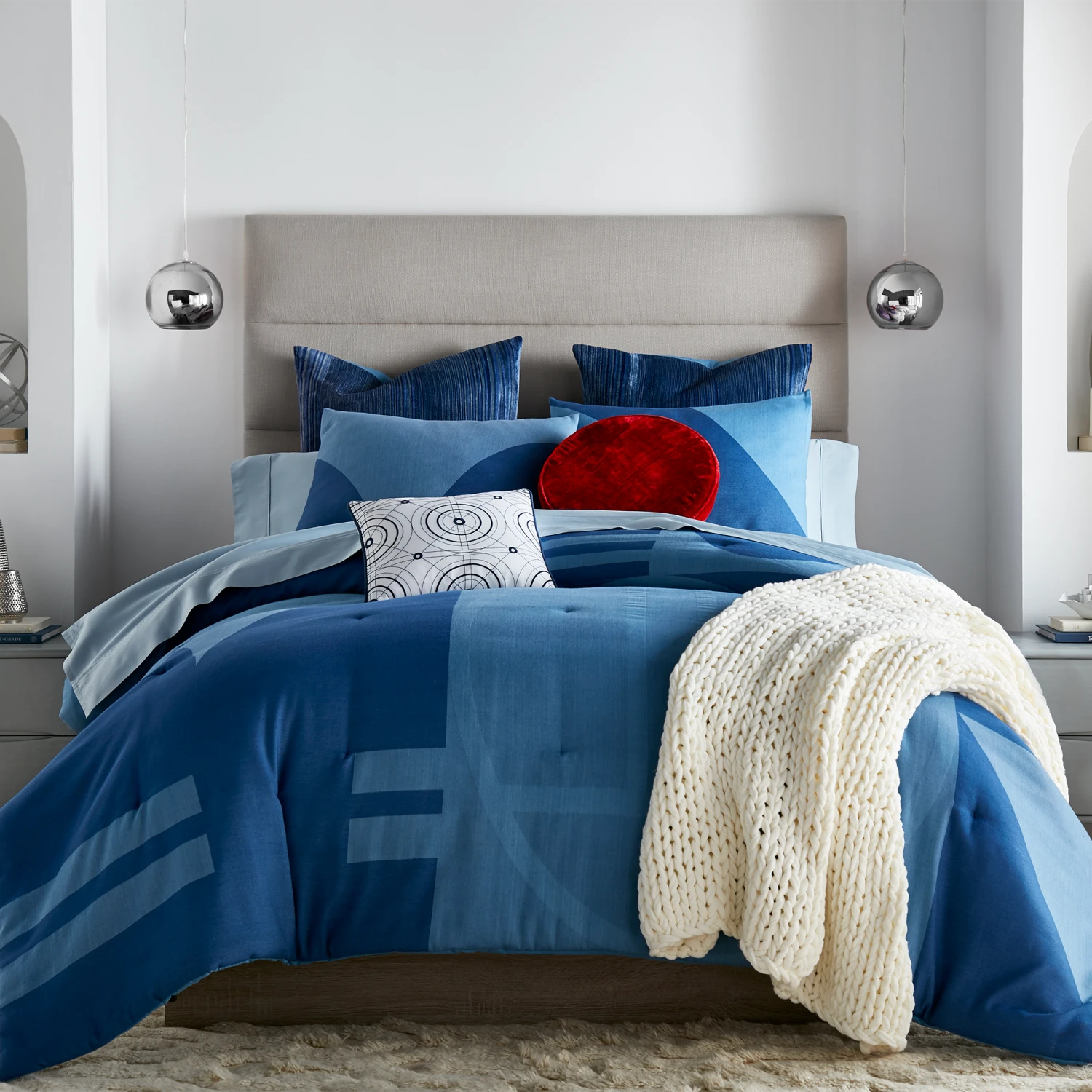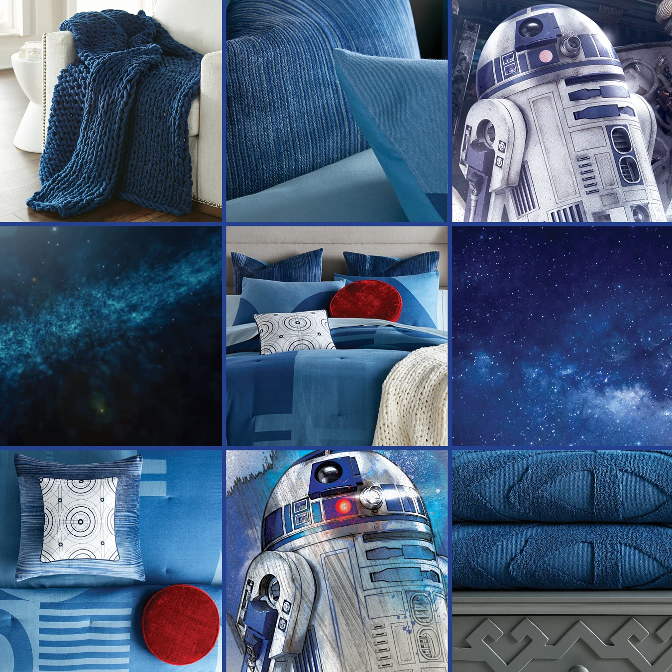 Bring the iconic R2-D2™ into your bedroom with our exquisite Star Wars bedding set. Inspired by the ever-faithful Astromech droid, this bed set is designed to capture the spirit of R2-D2™ with dynamic geometric patterns in various shades of blue. The textured ‘static’ look of our striped euro shams adds depth, and the set is crowned by the iconic round ‘Red Eye’ toss pillow, bringing the beloved feisty droid to life.